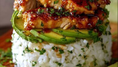 π― Honey Lime Chicken & Avocado Rice Stack π₯ A towering flavor bomb of sticky-sweet chicken, buttery avocado, and…